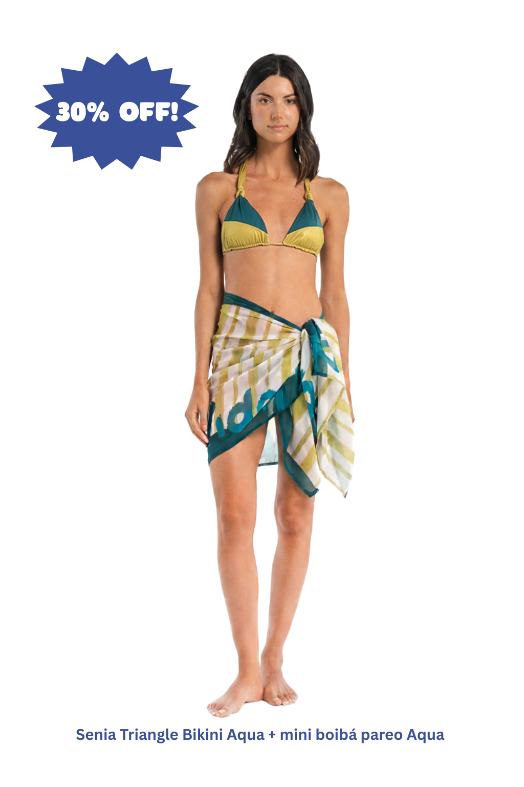 Includes the Senia Triangle Bikini Aqua and Ema Pareo Aqua—designed to be styled together.